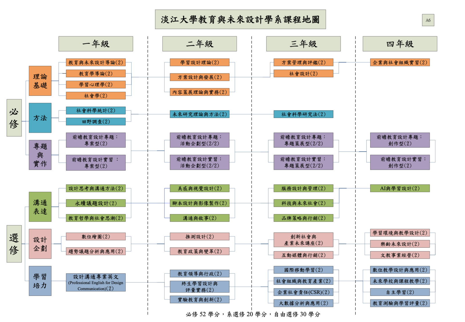 設計思考與溝通方法,永續議題設計,教育哲學與社會思潮,美感與視覺設計,腳本設計與影像製作,溝通與敘事,服務設計與管理,科技與未來社會,品牌策略與行銷,AI與學習設計